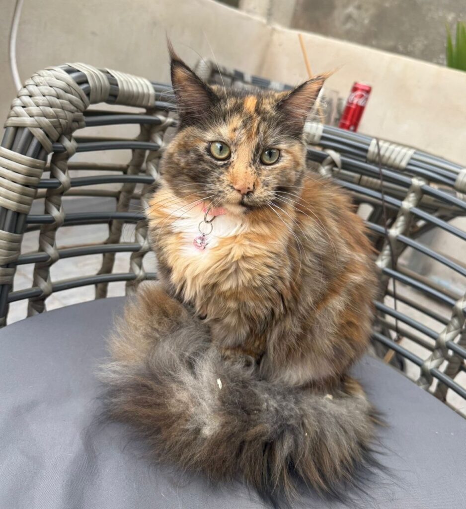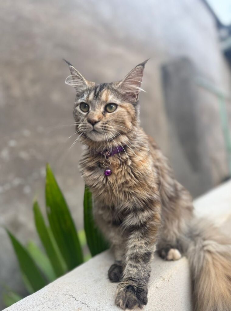 Luna is a playful female Maine Coon kitten with fluffy grey fur, bright eyes, and a gentle spirit. He loves cuddles, climbing, and chasing feathers.